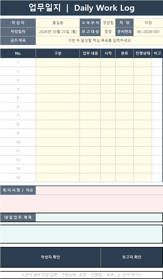 매일 업무가 끝나고 일지를 쓰려면 생각보다 시간이 걸립니다. 양식 찾고, 날짜 바꾸고, 항목 하나하나 채우다 보면 퇴근 전 10분이 훌쩍 지나가죠. 이 양식은 그 과정을 최대한 줄이고, 열자마자 바로 입력할 수 있도록 만들었습니다.