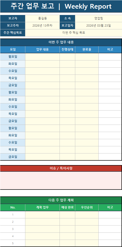 주간 보고 시트는 요일별 업무 내용과 완료율을 입력하는 구조입니다. 이슈·특이사항은 별도 블록으로 분리되어 있고, 다음 주 업무 계획도 우선순위(상/중/하)와 함께 정리할 수 있습니다.